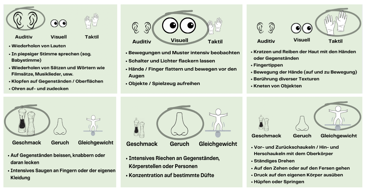 Die Übersicht gibt einen Überblick über die unterschiedlichen Arten von Stimming über die verschiedenen Sinneskanäle.